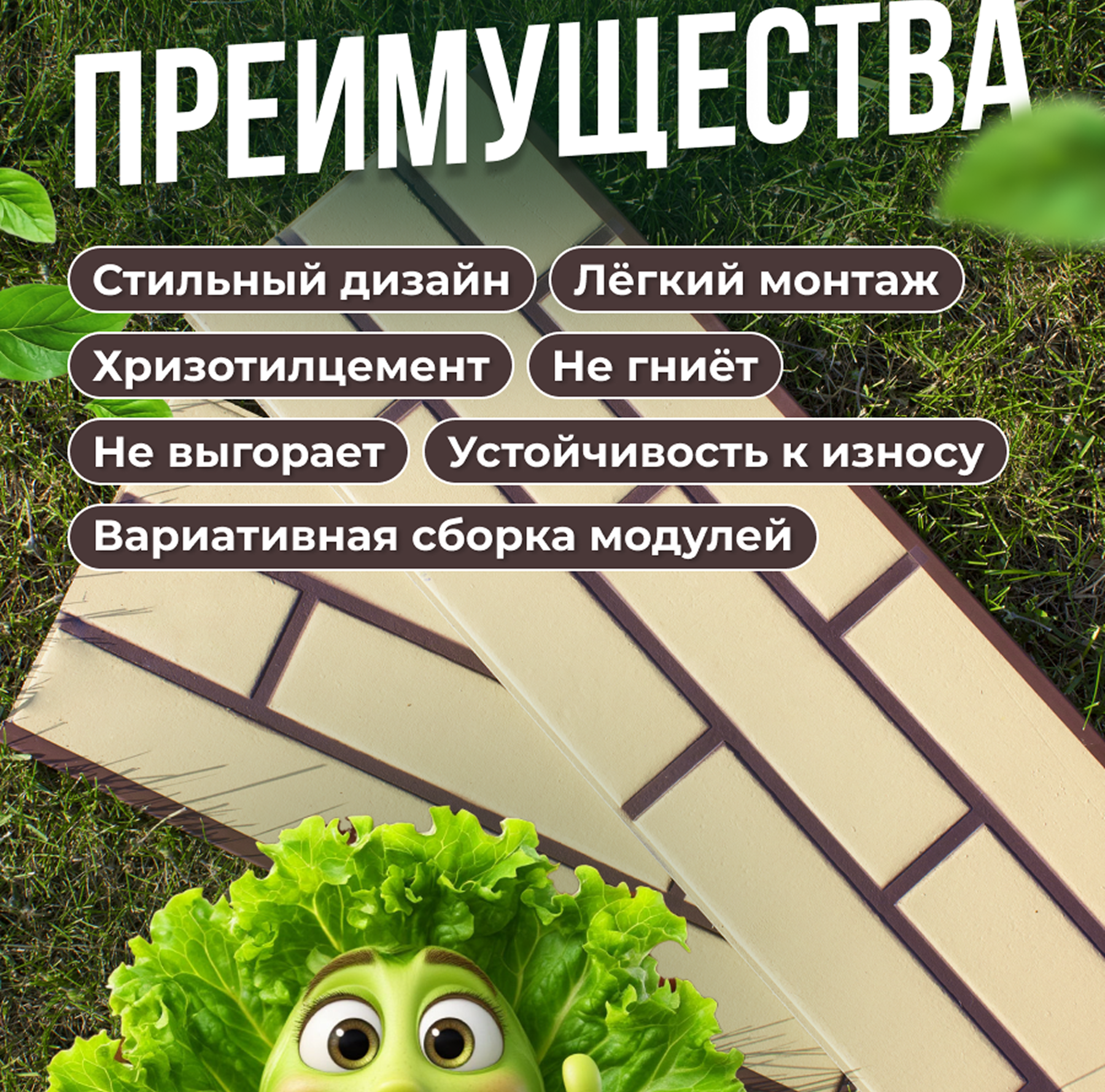 Экологически безопасный хризотилцемент не выделяет вредных веществ, а стильный внешний вид с текстурой, напоминающей натуральный кирпич,